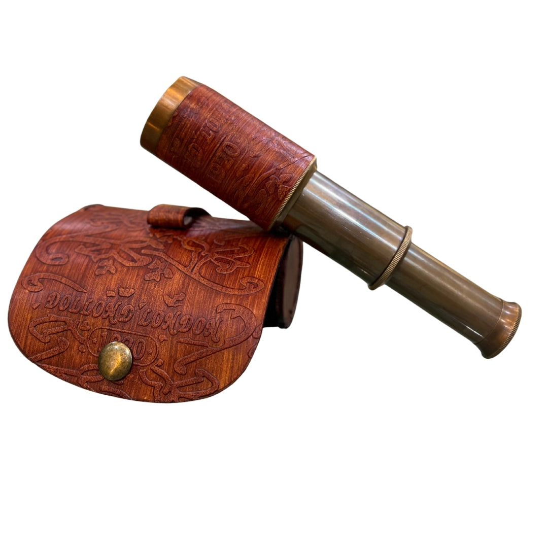 Experience the charm of exploration with this handcrafted brass spyglass telescope, elegantly wrapped in antique-style leather. Inspired by classic nautical instruments, this pocket telescope comes with a beautifully embossed leather case, making it both a functional optical tool and a stunning collectible piece. Perfect for maritime enthusiasts, history lovers, and home décor collectors, this spyglass is a symbol of adventure and timeless craftsmanship.